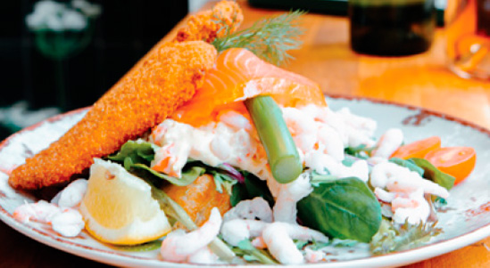 paneret rødspættefilet, rejer, koldrøget færøsk