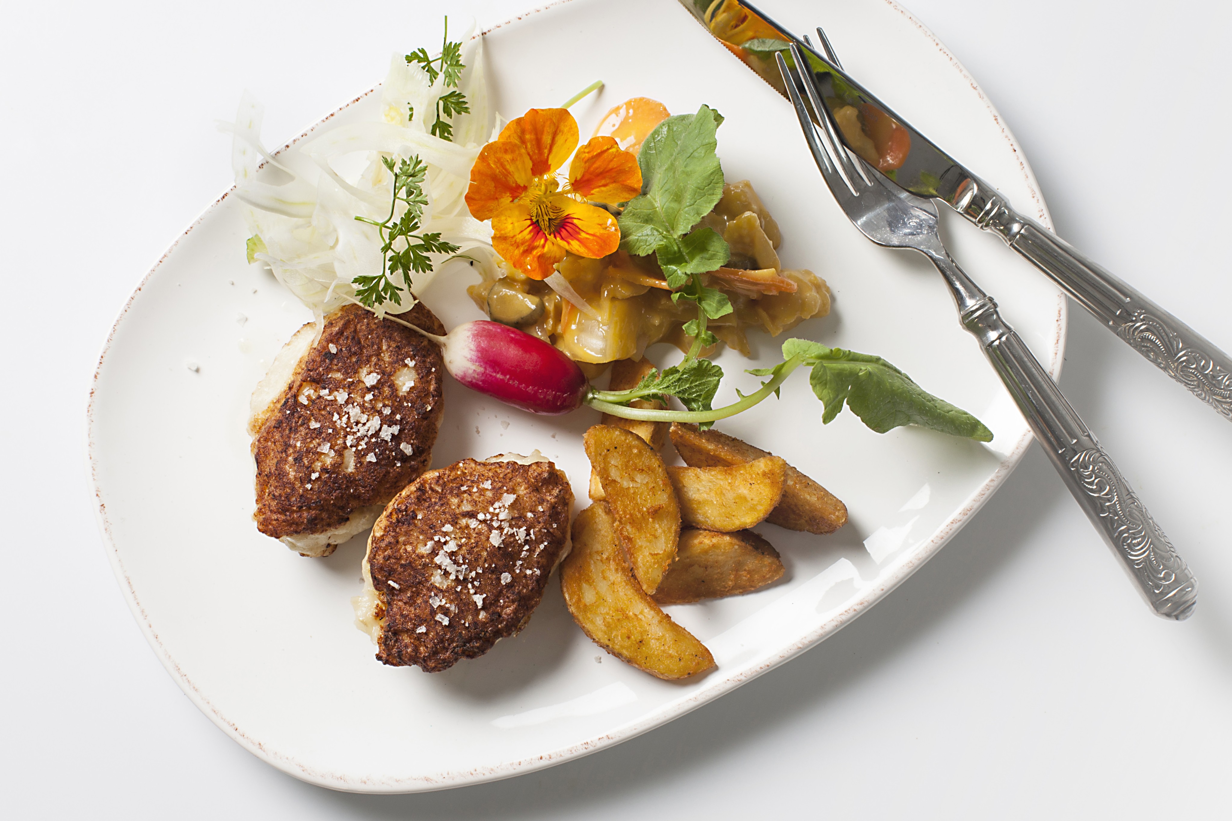 Fiskefrikadeller med grov pickles, sprøde fritter og fennikel