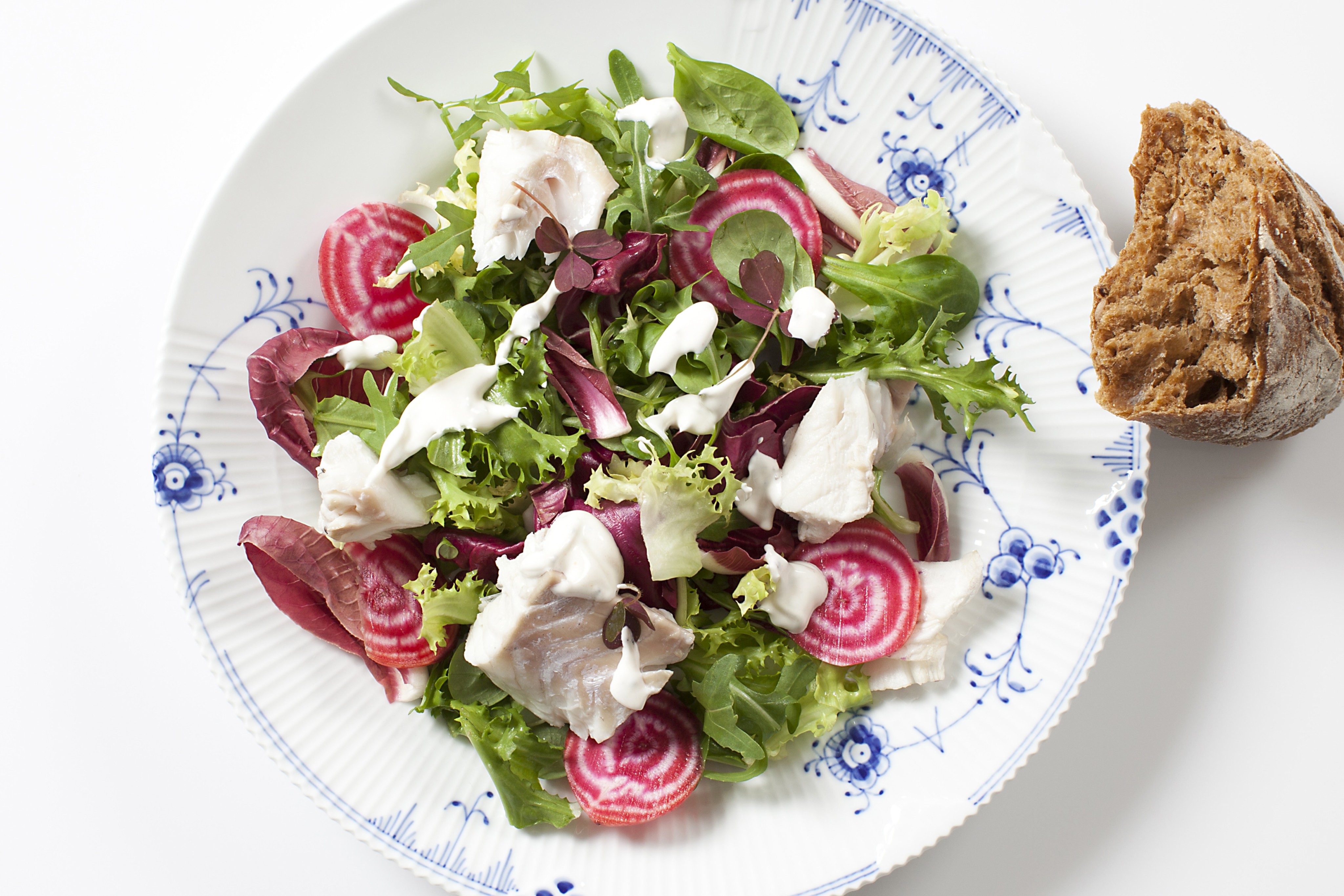Skyl den blandede salat og dryp den af, den vendes med tynde skiver af bolsje bede.