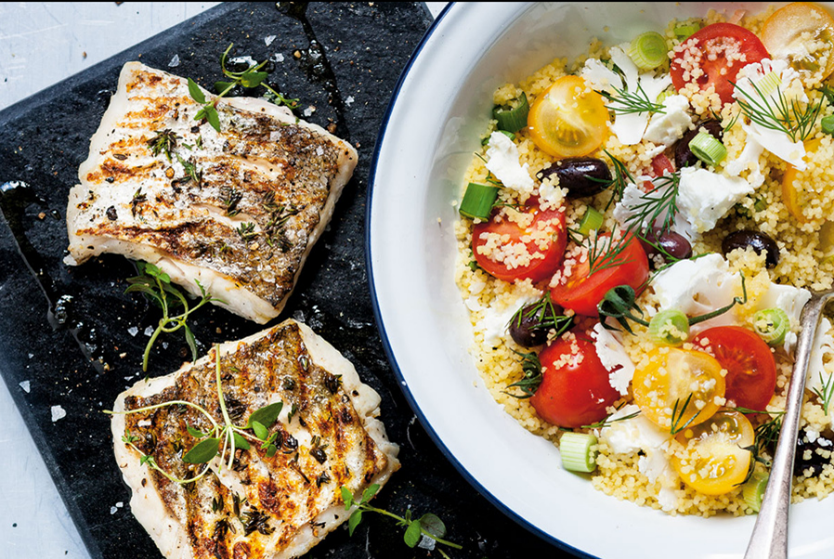 - Grill fisken på en varm grillpande eller havegrill i ca. 1,5 minut på hver side og servér den med couscoussen.