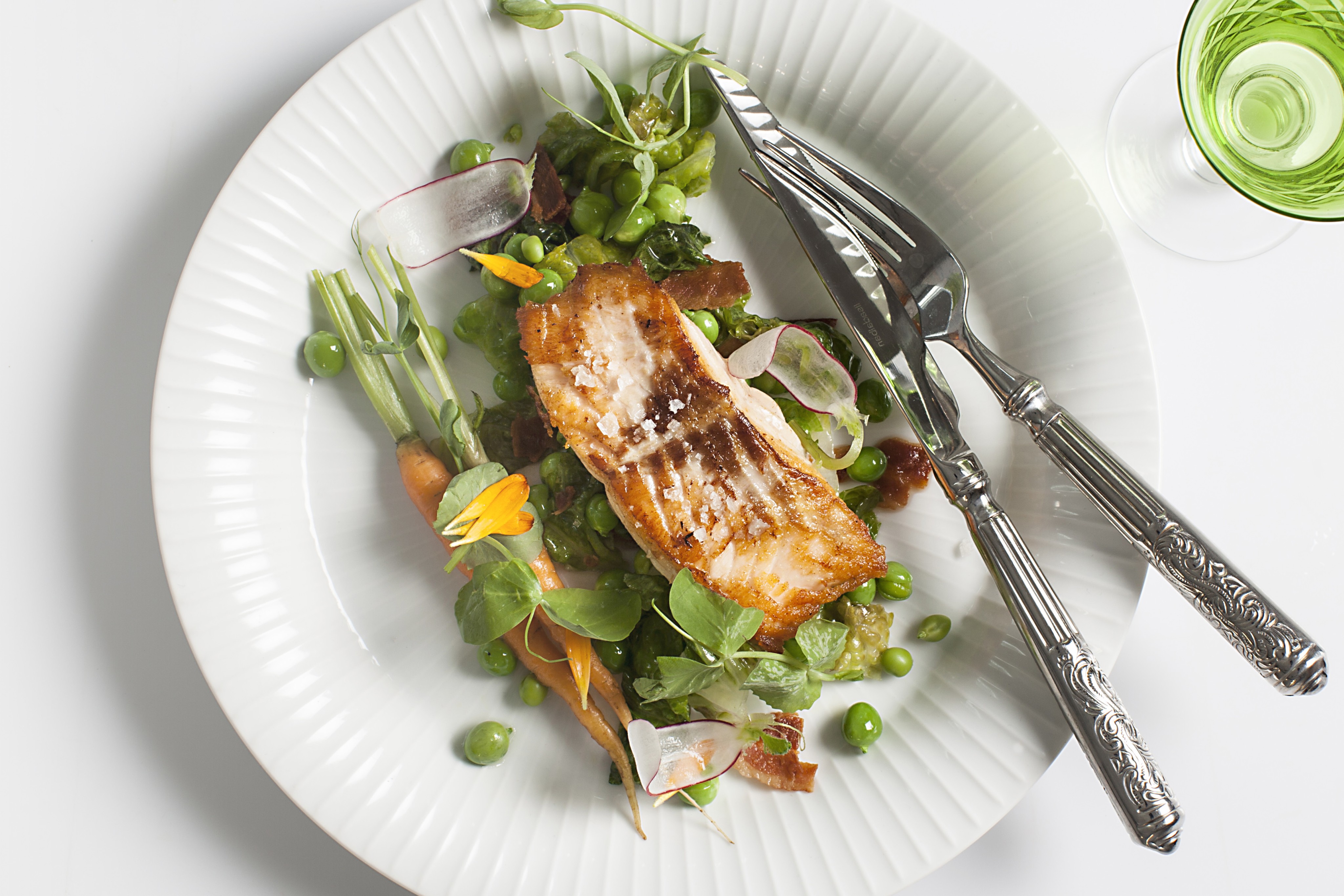 Ristet laks med ærter francaise, mini gulerødder samt crudité af radiser
