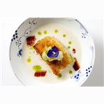 Skrubbe i panko med jordskokke suppe og bacon knas