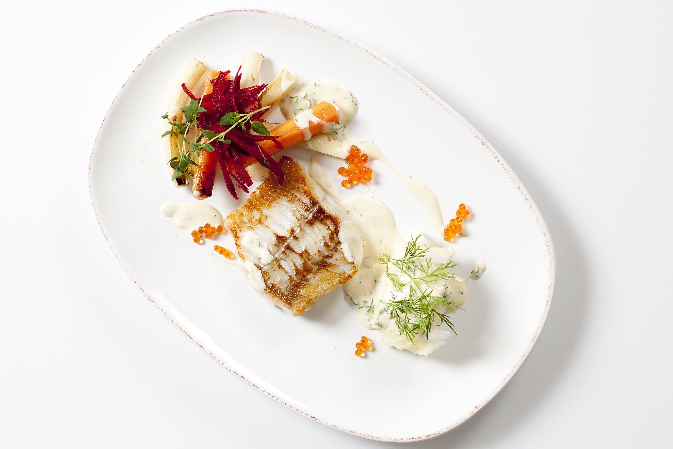 Sprød stegt kuller med brandade, stærke rødder og dild hollandaise