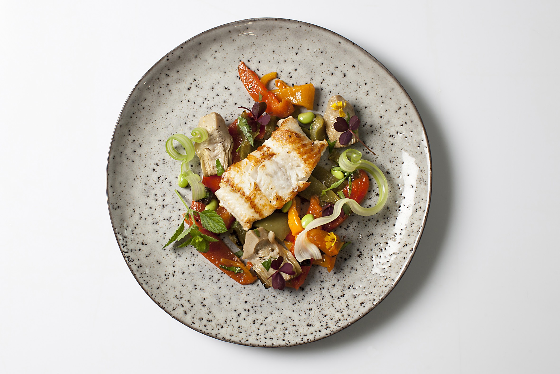 Stegt havkat med bagt peberfrugt ”multi-color”, artiskok og edamamebønner